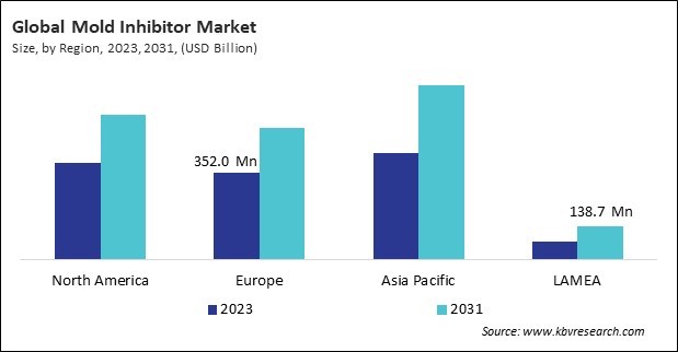 The Asia Pacific region dominated the Global Mold Inhibitor Market by Region in 2023, and would continue to be a dominant market till 2031; thereby, achieving a market value of $708.9 million by 2031. The North America region is anticipated to grow at a CAGR of 5.4% during (2024 - 2031). Additionally, The Europe region would witness a CAGR of 5.6% during (2024 - 2031).