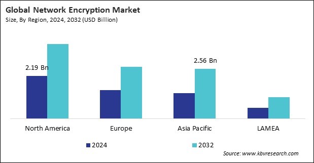 The North America region dominated the Global Network Encryption Market by Region in 2024, and would continue to be a dominant market till 2032; thereby, achieving a market value of $3,851 million by 2032. The Europe region is experiencing a CAGR of 7.9% during (2025 - 2032). Additionally, The Asia Pacific region would exhibit a CAGR of 9% during (2025 - 2032).