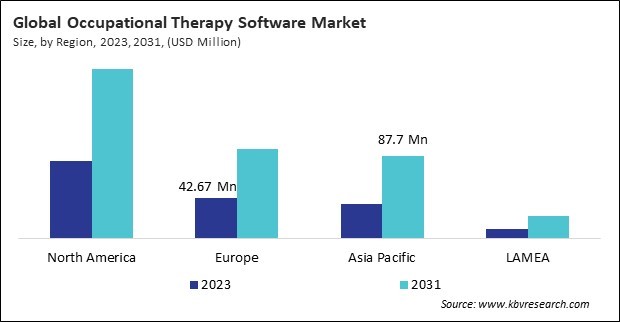 The North America region dominated the Global Occupational Therapy Software Market by Region in 2023, and would continue to be a dominant market till 2031; thereby, achieving a market value of $180.1 Million by 2031. The Asia Pacific region is anticipated to grow at a CAGR of 11.7% during (2024 - 2031). Additionally, The Europe region would witness a CAGR of 10.8% during (2024 - 2031).