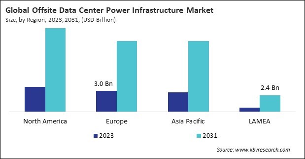 The North America region dominated the Global Offsite Data Center Power Infrastructure Market by Region in 2023, and would continue to be a dominant market till 2031; thereby, achieving a market value of $12.4 billion by 2031. The Europe region is anticipated to grow at a CAGR of 16.8% during (2024 - 2031). Additionally, The Asia Pacific region would witness a CAGR of 17.8% during (2024 - 2031).