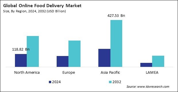 The Asia Pacific region dominated the Global Online Food Delivery Market by Region in 2024, and would continue to be a dominant market till 2032; thereby, achieving a market value of $427.5 billion by 2032. The North America region is anticipated to grow at a CAGR of 11.6% during (2025 - 2032). Additionally, The Europe region would witness a CAGR of 11.9% during (2025 - 2032).