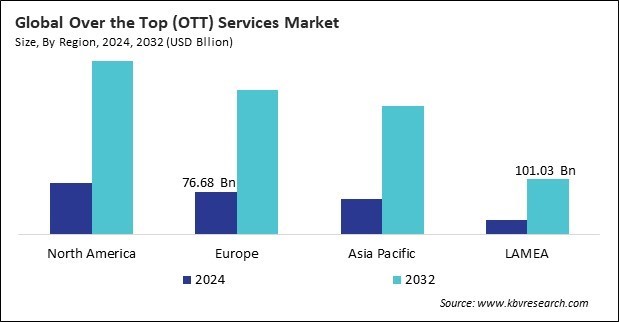 The North America region dominated the Global Over the Top (OTT) Services Market by Region in 2024, thereby, achieving a market value of $315.44 trillion by 2032. The Europe region is anticipated to grow a CAGR of 17.4% during (2025 - 2032). Additionally, The Asia Pacific region would witness a CAGR of 18.3% during (2025 - 2032).
