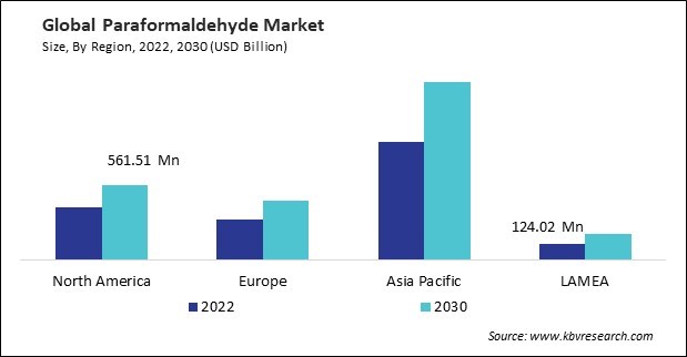 The Asia Pacific region dominated the Global Paraformaldehyde Market, By Region in 2022, and would continue to be a dominant market till 2030; thereby, achieving a market value of $1.3 billion by 2030. The North America region is experiencing a CAGR of 4.7% during (2023 - 2030). Additionally, The Europe region would witness a CAGR of 4.9% during (2023 - 2030).