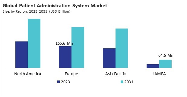 The North America region dominated the Global Patient Administration System Market by Region in 2023, and would continue to be a dominant market till 2031; thereby, achieving a market value of $374.7 million by 2031. The Europe region is anticipated to grow at a CAGR of 8.5% during (2024 - 2031). Additionally, The Asia Pacific region would witness a CAGR of 9.3% during (2024 - 2031).
