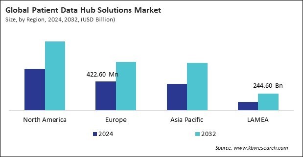 The North America region dominated the Global Patient Data Hub Solutions Market by Region in 2024, thereby, achieving a market value of $1001.3 million by 2032. The Europe region is anticipated to grow a CAGR of 6.9% during (2025 - 2032). Additionally, The Asia Pacific region would witness a CAGR of 7.9% during (2025 - 2032).