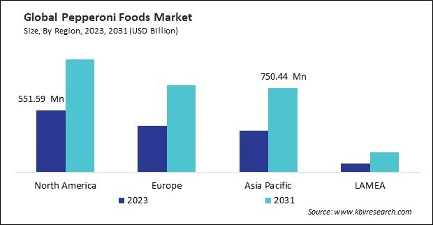 The North America region dominated the Global Pepperoni Foods Market by Region in 2023, and would continue to be a dominant market till 2031; thereby, achieving a market value of $1.0 billion by 2031. The Europe region is poised to grow a CAGR of 8.2% during (2024 - 2031). Additionally, The Asia Pacific region would witness a CAGR of 9.5% during (2024 - 2031).