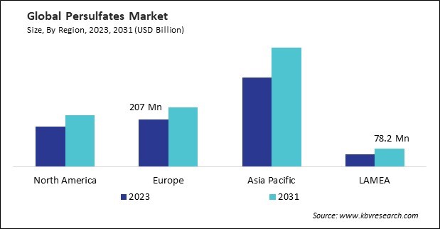 The Asia Pacific region dominated the Global Persulfates Market by Region in 2023, and would continue to be a dominant market till 2031; thereby, achieving a market value of $522.8 million by 2031. The Europe region is anticipated to grow at a CAGR of 3.1% during (2024 - 2031). Additionally, The North America region would witness a CAGR of 3.3% during (2024 - 2031).