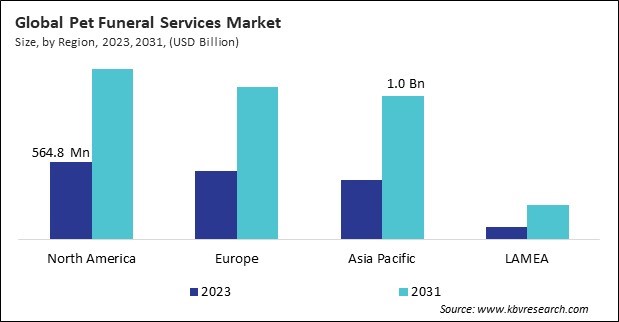 The North America market dominated the Global Pet Funeral Services Market by Region in 2023; thereby, achieving a market value of $1.2 billion by 2031. The Europe region is poised to grow at a CAGR of 10.8% during (2024 - 2031). Additionally, The Asia Pacific region would witness a CAGR of 11.8% during (2024 - 2031).