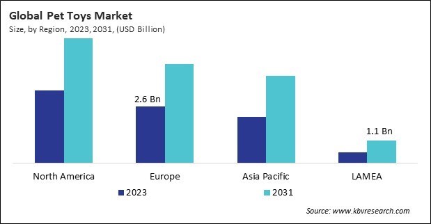 The North America region dominated the Global Pet Toys Market by Region in 2023, and would continue to be a dominant market till 2031; thereby, achieving a market value of $5.6 billion by 2031. The Europe region is poised to grow at a CAGR of 7.4% during (2024 - 2031). Additionally, The Asia Pacific region would exhibit a CAGR of 8.3% during (2024 - 2031).