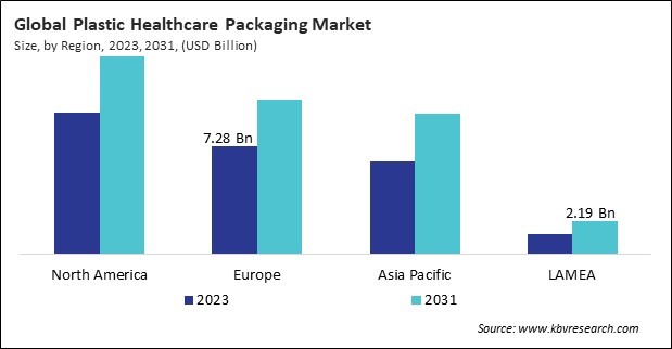 The North America market dominated the Global Plastic Healthcare Packaging Market by Region in 2023, and would continue to be a dominant market till 2031; thereby, achieving a market value of $13,300.7 million by 2031. The Europe market is expected to witness a CAGR of 4.7% during (2024 - 2031). Additionally, The Asia Pacific market is expected to witness a CAGR of 5.6% during (2024 - 2031).