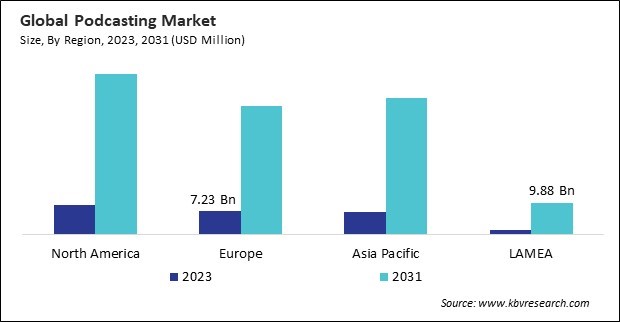The North America region dominated the Global Podcasting Market by Region in 2023, thereby, achieving a market value of $50.24 Billion by 2031. The Europe region is anticipated to grow at a CAGR of 24.6% during (2024 - 2031). Additionally, The Asia Pacific region would witness a CAGR of 26% during (2024 - 2031).