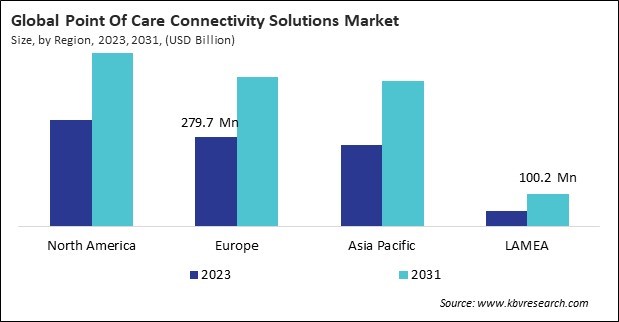 The North America region dominated the Global Point Of Care Connectivity Solutions Market by Region in 2023; thereby, achieving a market value of $542.5 million by 2031. The Europe segment is anticipated to grow at a CAGR of 6.8% during (2024 - 2031). Additionally, The Asia Pacific segment would witness a CAGR of 7.7% during (2024 - 2031).