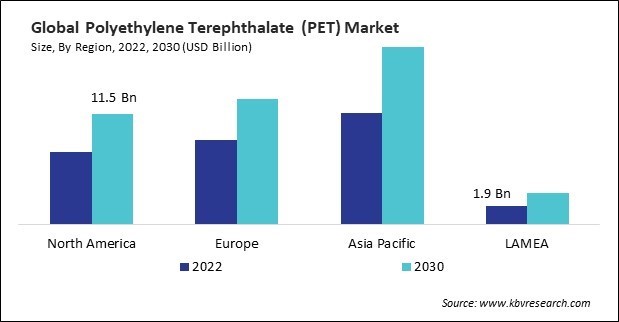 The Asia Pacific region dominated the Global Polyethylene Terephthalate (PET) Market by Region in 2022, and would continue to be a dominant market till 2030; thereby, achieving a market value of $18.5 Billion by 2030. The Europe region is anticipated to grow a CAGR of 5% during (2023 - 2030). Additionally, The North America market would witness a CAGR of 5.5% during (2023 - 2030).