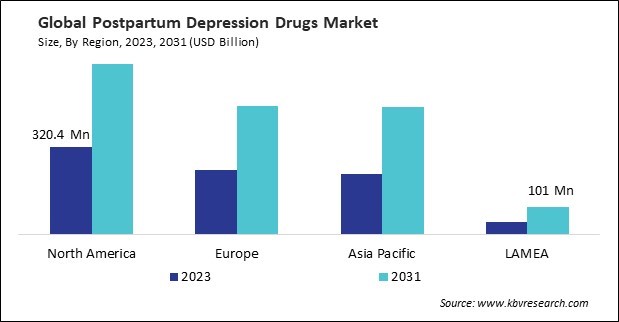 The North America region dominated the Global Postpartum Depression Drugs Market by Region in 2023, and would continue to be a dominant market till 2031; thereby, achieving a market value of $622.2 million by 2031. The Europe region is anticipated to grow at a CAGR of 9.2% during (2024 - 2031). Additionally, The Asia Pacific region would witness a CAGR of 10% during (2024 - 2031).