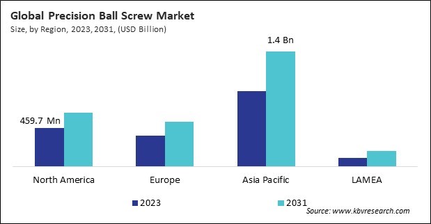 The Asia Pacific region dominated the Global Precision Ball Screw Market by Region in 2023, and would continue to be a dominant market till 2031; thereby, achieving a market value of $1.4 billion by 2031. The North America region is experiencing a CAGR of 4.5% during (2024 - 2031). Additionally, The Europe region would showcase a CAGR of 4.8% during (2024 - 2031).