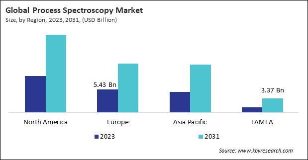 The North America region dominated the Global Process Spectroscopy Market by Region in 2023, and would continue to be a dominant market till 2031; thereby, achieving a market value of $18.4 billion by 2031. The Europe region is showcasing a CAGR of 10.3% during (2024 - 2031). Additionally, The Asia Pacific region would exhibit a CAGR of 11.7% during (2024 - 2031).