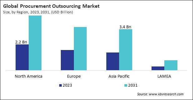 The North America region dominated the Global Procurement Outsourcing Market by Region in 2023; thereby, achieving a market value of $4,.6 billion by 2031. The Europe region is poised to grow at a CAGR of 10.3% during (2024 - 2031). Additionally, The Asia Pacific region would witness a CAGR of 11.3% during (2024 - 2031).