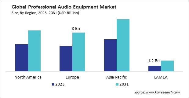 The Asia Pacific region dominated the Global Professional Audio Equipment Market by Region in 2023, and would continue to be a dominant market till 2031; thereby, achieving a market value of $10.7 billion by 2031. The North America region is anticipated to grow at a CAGR of 5.4% during (2024 - 2031). Additionally, The Europe region would witness a CAGR of 5.6% during (2024 - 2031).