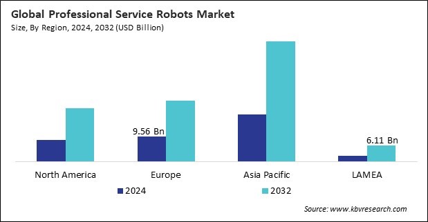 The Asia Pacific market dominated the Global Professional Service Robots Market by Region in 2024, and would continue to be a dominant market till 2032; thereby, achieving a market value of $45.3 billion by 2032. The Europe market is experiencing a CAGR of 11.8% during (2025 - 2032). Additionally, The North America market would exhibit a CAGR of 12.1% during (2025 - 2032).