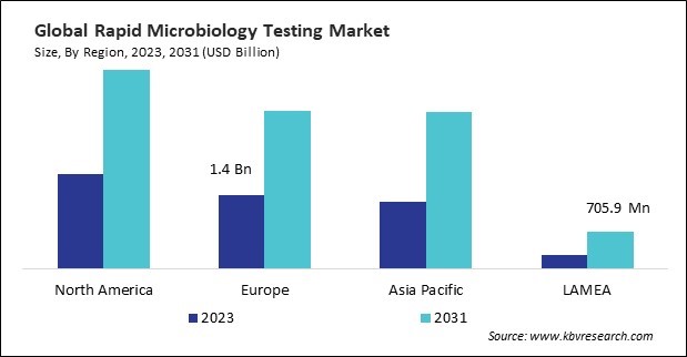 The North America region dominated the Global Rapid Microbiology Testing Market by Region in 2023, and would continue to be a dominant market till 2031; thereby, achieving a market value of $3.7 billion by 2031. The Europe region is anticipated to grow at a CAGR of 10.1% during (2024 - 2031). Additionally, The Asia Pacific region would witness a CAGR of 11.3% during (2024 - 2031).
