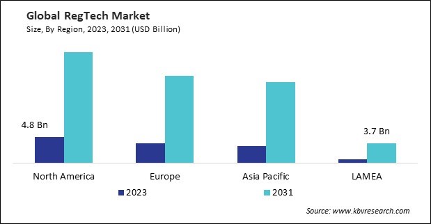 The North America region dominated the Global RegTech Market by Region in 2023, and would continue to be a dominant market till 2031; thereby, achieving a market value of $20.7 Billion by 2031. The Europe region is anticipated to grow at a CAGR of 20.6% during (2024 - 2031). Additionally, The Asia Pacific region would witness a CAGR of 22% during (2024 - 2031).