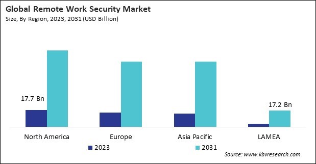The North America region dominated the Global Remote Work Security Market by Region in 2023, and would continue to be a dominant market till 2031; thereby, achieving a market value of $78.2 billion by 2031. The Europe region is anticipated to grow at a CAGR of 21.3% during (2024 - 2031). Additionally, The Asia Pacific region would witness a CAGR of 22.3% during (2024 - 2031).
