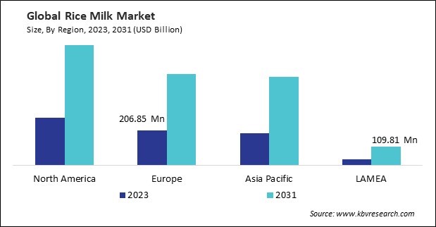 The North America region dominated the Global Rice Milk Market by Region in 2023, and would continue to be a dominant market till 2031; thereby, achieving a market value of $711.5 Million by 2031. The Europe region is experiencing a CAGR of 13.7% during (2024 - 2031). Additionally, The Asia Pacific region would showcase a CAGR of 14.5% during (2024 - 2031).