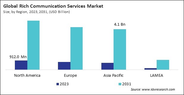 The North America region dominated the Global Rich Communication Services Market by Region in 2023, and would continue to be a dominant market till 2031; thereby, achieving a market value of $4.9 billion by 2031. The Europe region is anticipated to grow at a CAGR of 24.5% during (2024 - 2031). Additionally, The Asia Pacific region would witness a CAGR of 25.4% during (2024 - 2031).