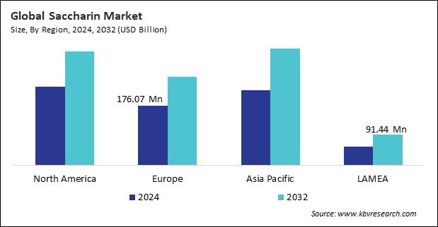 The Asia Pacific region dominated the Global Saccharin Market by Region in 2032, thereby, achieving a market value of $345.4 million by 2032. The North America region is anticipated to grow at a CAGR of 4.9% during (2025 - 2032). Additionally, The Europe region would witness a CAGR of 5.3% during (2025 - 2032).
