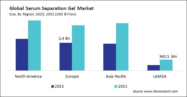 The North America region dominated the Global Serum Separation Gel Market by Region in 2023 and would continue to be a dominant market till 2031; thereby, achieving a market value of $4.3 billion by 2031. The Europe region is experiencing a CAGR of 6.3% during (2024 - 2031). Additionally, The Asia Pacific region would exhibit a CAGR of 7.4% during (2024 - 2031).