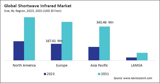 The North America region dominated the Global Shortwave Infrared Market by Region in 2023, and would continue to be a dominant market till 2031; thereby, achieving a market value of $435.1 million by 2031. The Europe region is experiencing a CAGR of 11.4% during (2024 - 2031). Additionally, The Asia Pacific region would exhibit a CAGR of 12.4% during (2024 - 2031).