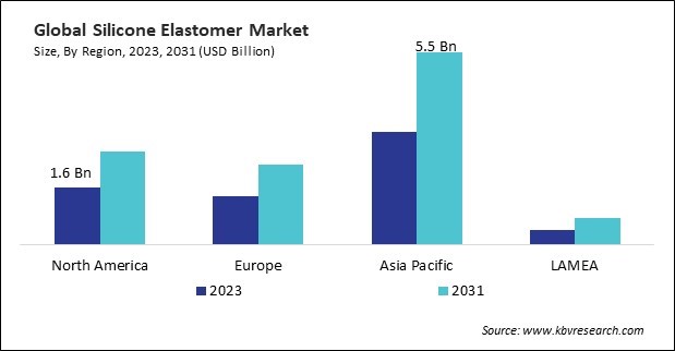 The Asia Pacific region dominated the Global Silicone Elastomer Market, by Region in 2023, and would continue to be a dominant market till 2031; thereby, achieving a market value of $5.5 Billion by 2031. The North America region is anticipated to grow at a CAGR of 6.2% during (2024 - 2031). Additionally, The Europe region would witness a CAGR of 6.5% during (2024 - 2031).