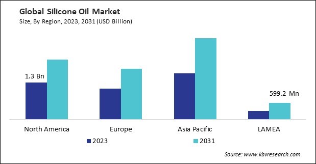 The Asia Pacific region dominated the Global Silicone Oil Market by Region in 2023; thereby, achieving a market value of $2.9 billion by 2031. The North America region is poised to grow at a CAGR of 6.3% during (2024 - 2031). Additionally, The Europe region would exhibit a CAGR of 6.6% during (2024 - 2031).