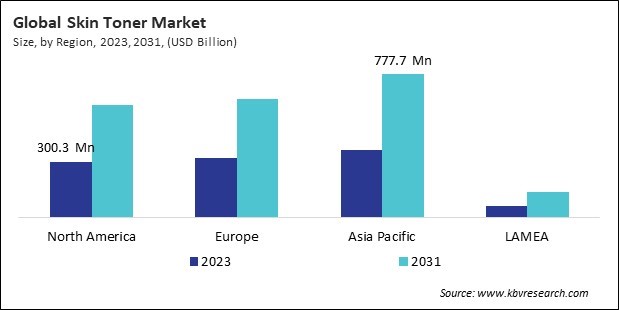 The Asia Pacific region dominated the Global Skin Toner Market by Region in 2023; thereby, achieving a market value of $777.7 million by 2031. The Europe region would witness a CAGR of 9.6% during (2024 - 2031). Additionally, The North America region is poised to grow at a CAGR of 9.9% during (2024 - 2031).