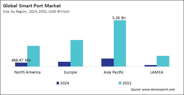 The Asia Pacific region dominated the Global Smart Port Market by Region in 2024, and would continue to be a dominant market till 2032; thereby, achieving a market value of $5.2 billion by 2032. The Europe region is experiencing a CAGR of 23.5% during (2025 - 2032). Additionally, The North America region would exhibit a CAGR of 22.5% during (2025 - 2032).
