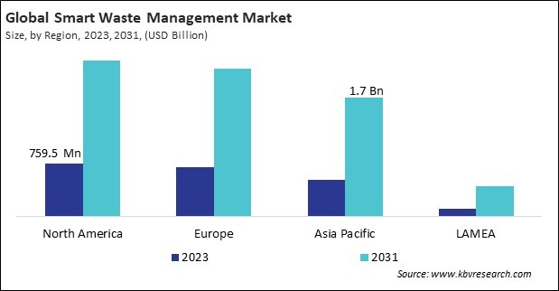 The North America region dominated the Global Smart Waste Management Market by Region in 2023, and would continue to be a dominant market till 2031; thereby, achieving a market value of $2.2 billion by 2031. The Europe region is anticipated to grow at a CAGR of 14.9% during (2024 - 2031). Additionally, The Asia Pacific region would witness a CAGR of 15.9% during (2024 - 2031).