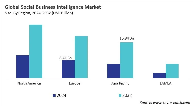 The North America region dominated the Global Social Business Intelligence Market by Region in 2024, thereby, achieving a market value of $25.18 billion by 2032. The Europe region is anticipated to grow a CAGR of 11.5% during (2025 - 2032). Additionally, The Asia Pacific region would witness a CAGR of 12.5% during (2025 - 2032).