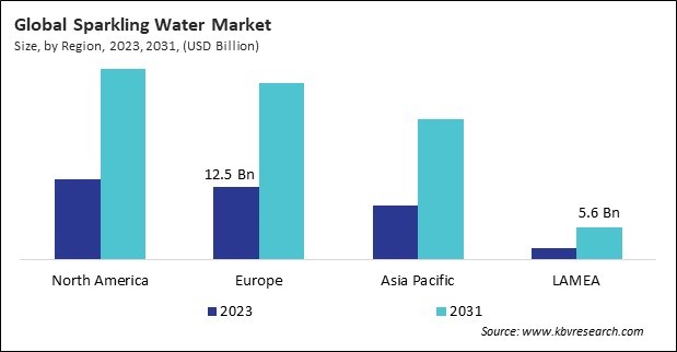 The North America region dominated the Global Sparkling Water Market by Region in 2023, and would continue to be a dominant market till 2031; thereby, achieving a market value of $32.8 Billion by 2031. The Europe region is anticipated to grow at a CAGR of 11.9% during (2024 - 2031). Additionally, The Asia Pacific region would witness a CAGR of 12.7% during (2024 - 2031).