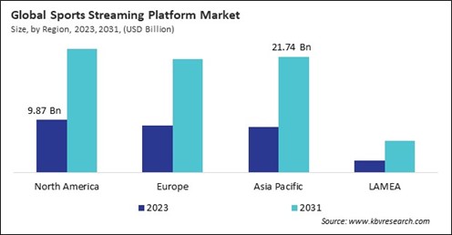 The North America region dominated the Global Sports Streaming Platform Market by Region in 2023, thereby, achieving a market value of $23.21 billion by 2031. The Europe region is anticipated to grow a CAGR of 11.9% during (2024 - 2031). Additionally, The Asia Pacific region would witness a CAGR of 12.7% during (2024 - 2031).