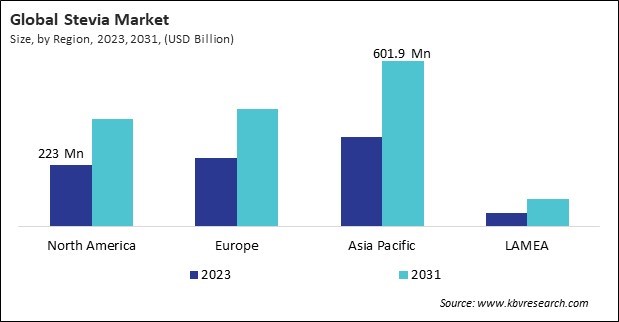 The Asia Pacific region dominated the Global Stevia Market by Region in 2023, and would continue to be a dominant market till 2031; thereby, achieving a market value of $601.9 million by 2031. The Europe region is anticipating a CAGR of 7.2% during (2024 - 2031). Additionally, The North America region would exhibit a CAGR of 7.4% during (2024 - 2031).
