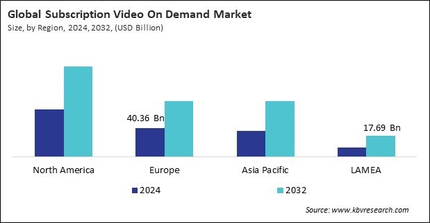 The North America region dominated the Global Subscription Video On Demand Market by Region in 2024, and would continue to be a dominant market till 2032; thereby, achieving a market value of $77.0 billion by 2032. The Europe region is anticipated to grow at a CAGR of 8.8% during (2025 - 2032). Additionally, The Asia Pacific region would witness a CAGR of 10.2% during (2025 - 2032).