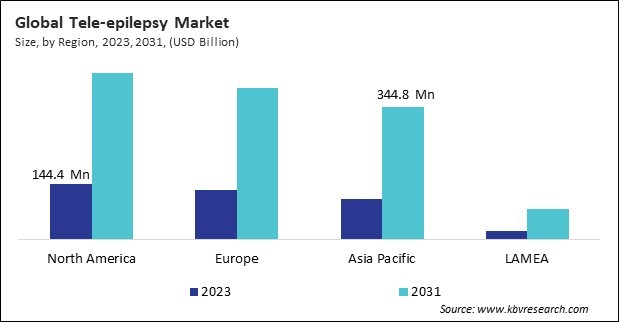 The North America region dominated the Global Tele-epilepsy Market by Region in 2023; thereby, achieving a market value of $432.5 million by 2031. The Europe region is poised to grow at a CAGR of 15.2% during (2024 - 2031). Additionally, The Asia Pacific region would witness a CAGR of 16.1% during (2024 - 2031).