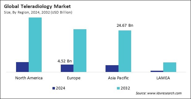 The North America region dominated the Global Teleradiology Market by Region in 2024, and would continue to be a dominant market till 2032; thereby, achieving a market value of $32.38 billion by 2032. The Europe region is experiencing a CAGR of 24.6% during (2025 - 2032). Additionally, The Asia Pacific region would exhibit a CAGR of 25.7% during (2025 - 2032).