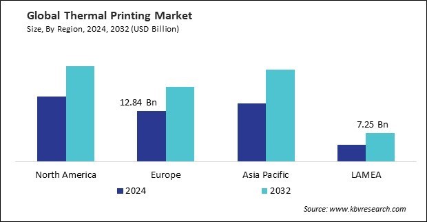 The North America region dominated the Global Thermal Printing Market by Region in 2024, and would continue to be a dominant market till 2032; thereby, achieving a market value of $24.1 billion by 2032. The Asia Pacific region is anticipated to grow at a CAGR of 6% during (2025 - 2032). Additionally, The Europe region would witness a CAGR of 5.1% during (2025 - 2032).