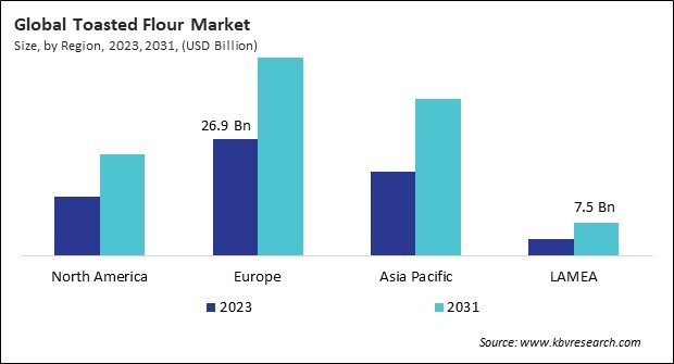 The Europe region dominated the Global Toasted Flour Market by Region in 2023; thereby, achieving a market value of $45.6 billion by 2031. The Asia Pacific region is poised to grow at a CAGR of 8.3% during (2024 - 2031). Additionally, The North region would witness a CAGR of 7.3% during (2024 - 2031).