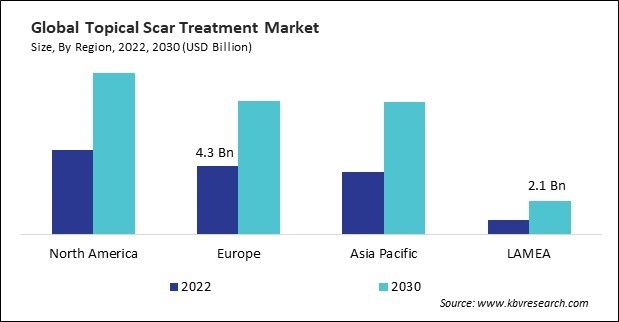 The North America region dominated the Global Topical Scar Treatment Market by Region in 2022, and would continue to be a dominant market till 2030; thereby, achieving a market value of $10.1 billion by 2030. The Europe region is anticipated to grow at a CAGR of 8.9% during (2023 - 2030). Additionally, The Asia Pacific region would witness a CAGR of 10.1% during (2023 - 2030).