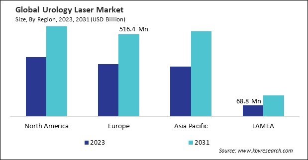 The North America region dominated the Global Urology Laser Market by Region in 2023, and would continue to be a dominant market till 2031; thereby, achieving a market value of $567.6 million by 2031. The Europe region is anticipated to grow at a CAGR of 5.9% during (2024 - 2031). Additionally, The Asia Pacific region would witness a CAGR of 7% during (2024 - 2031).
