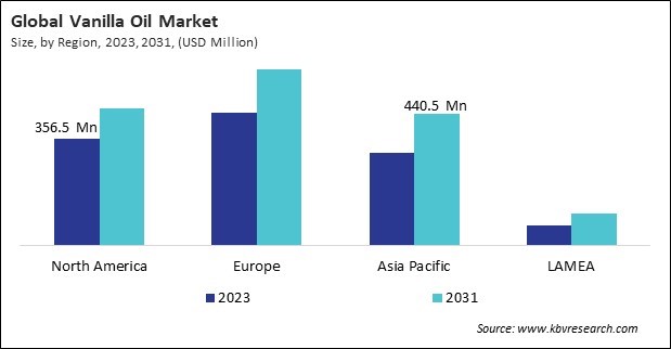 The Europe region dominated the Global Vanilla Oil Market by Region in 2023; thereby, achieving a market value of $592.2 Million by 2031. The North America region is poised to grow at a CAGR of 3.4% during (2024 - 2031). Additionally, The Asia Pacific region would witness a CAGR of 4.6% during (2024 - 2031).