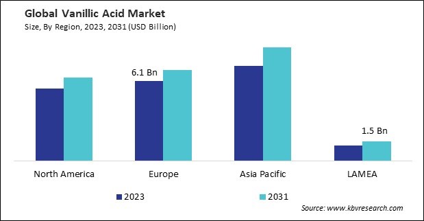 The Asia Pacific region dominated the Global Vanillic Acid Market by Region in 2023, and would continue to be a dominant market till 2031; thereby, achieving a market value of $8.6 billion by 2031. The North America region is anticipating a CAGR of 1.9% during (2024 - 2031). Additionally, The Europe region would exhibit a CAGR of 1.7% during (2024 - 2031).