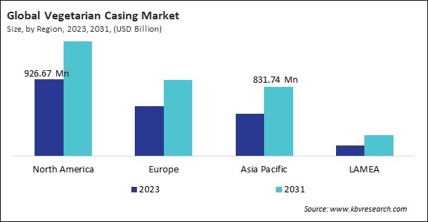 The North America region dominated the Global Vegetarian Casing Market by Region in 2023; thereby, achieving a market value of $1.38 billion by 2031. The Europe region is expected to witness a CAGR of 5.6% during (2024 - 2031). Additionally, The Asia Pacific region would register a CAGR of 6.6% during (2024 - 2031).